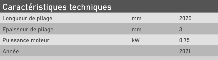 Plieuse à tablier Arrow PMO 2020*3 d’occasion, conçue pour le pliage précis de tôles jusqu’à 3 mm d’épaisseur sur une longueur de 2020 mm. Équipée d’une ligne d’outillage fractionnée et d’un réglage d’angle motorisé, idéale pour les travaux de tôlerie fine.
