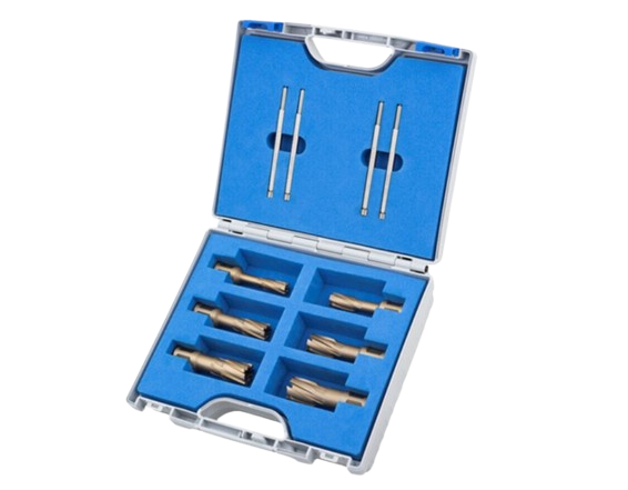 Le coffret comprend 6 fraises à carotter CARBURE Weldon 19 mm, longueur de coupe 40 mm, couvrant les diamètres Ø 12, 14, 16, 18, 20 et 22 mm. Il est complété par 4 pilotes éjecteurs adaptés aux différents diamètres. Ce coffret est idéal pour le perçage intensif dans les aciers, inox et matériaux fortement alliés, en atelier comme sur chantier.